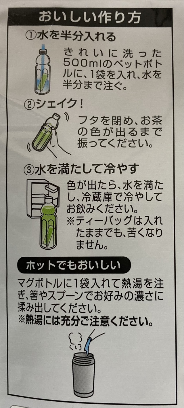 リサイクルペットボトルやマイボトルへティーバッグ1本と水500mlを入れてシェイクすればどこよりも美味しいペットボトル茶のできあがり!お子様も簡単に作ることができます。