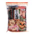原材料名:水稲もち米(国内産100%)、植物油、しょうゆ(大豆・小麦)、砂糖、アーモンド、海苔、胡麻、食塩、昆布、でん粉、えび、青海苔、はっ酵調味料、風味原料(鰹節・昆布・鯖節)、たん白加水分解物、昆布エキス、酵母エキス、デキストリン、ガーリック、調味料(アミノ酸等)、増粘剤(加工デンプン)、着色料(紅麹・カラメル・アナトー)