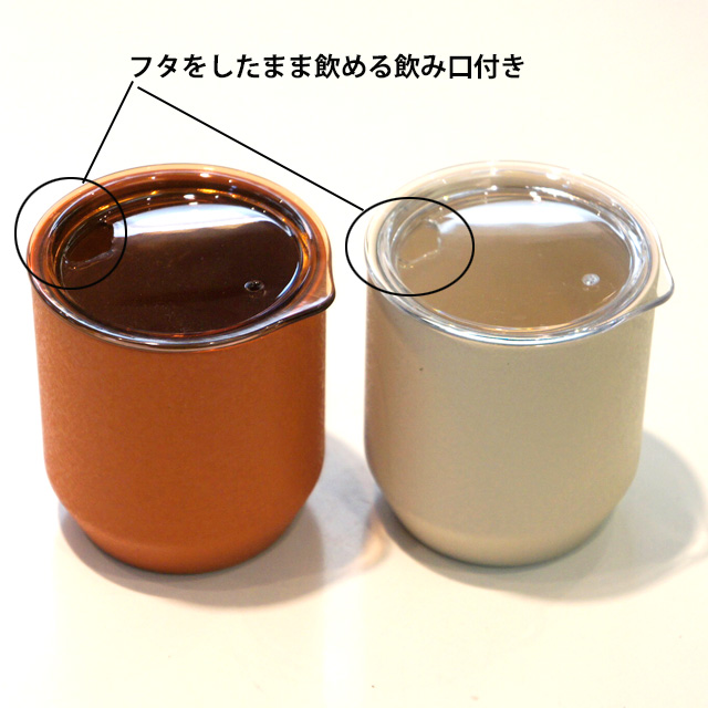 フタつきで保冷・保温もできます。さらにフタには飲み口がついているのでフタをしたままお飲みいただけます。