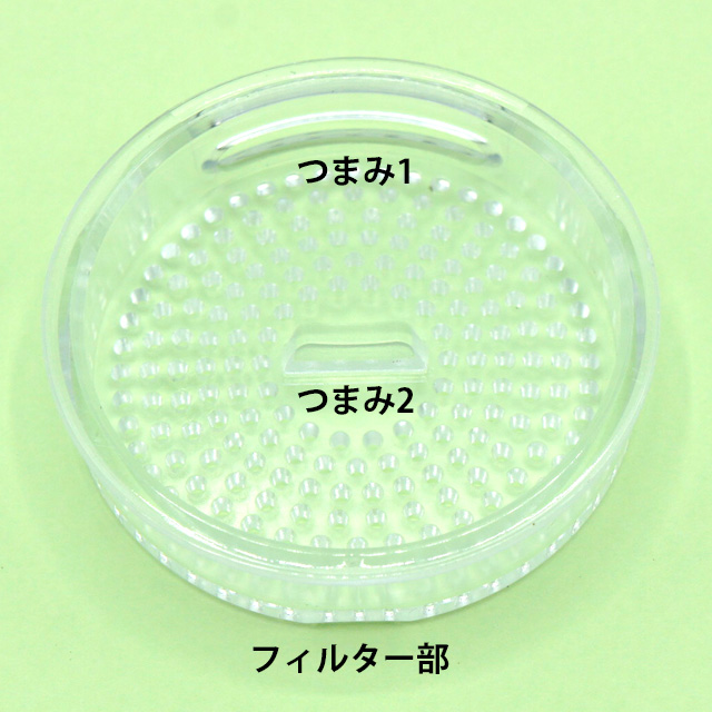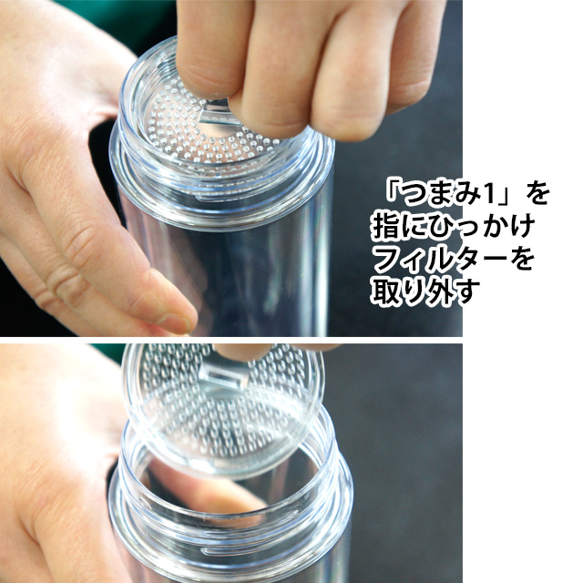 フィルターには2つのつまみがあり、「つまみ1」はフィルターを外すときに使い「つまみ2」はフィルターをはめるときに使います。