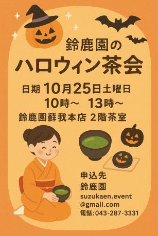 10月25日土曜日10時〜、13時〜鈴鹿園蘇我本店2階茶室にて開催します!鈴鹿園茶道教室にてお稽古している生徒様が亭主としてお茶とお菓子をお出しします。