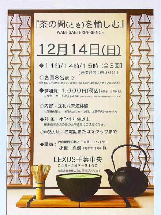 LEXUS千葉中央オーナー様向けイベント なんと鈴鹿園が担当します!緊張するけど頑張ります! #LEXUS #レクサス #茶道体験 #出張茶道体験 #出張茶道 #鈴鹿園 #お茶屋 #千葉 #蘇我 #西千葉 2025.11.18 16:13 店長日記