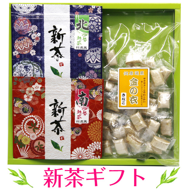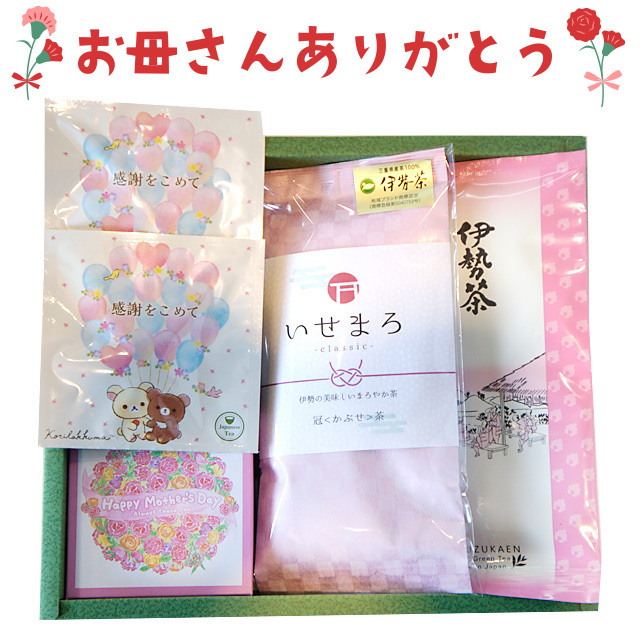 【母の日ギフト2023】かぶせ茶100g、伊勢茶「だんらん」100g、日本一おいしい伊勢茶ティーバッグ2個(リラックマ)、和三盆糖干菓子セット¥3,292 (税込) -